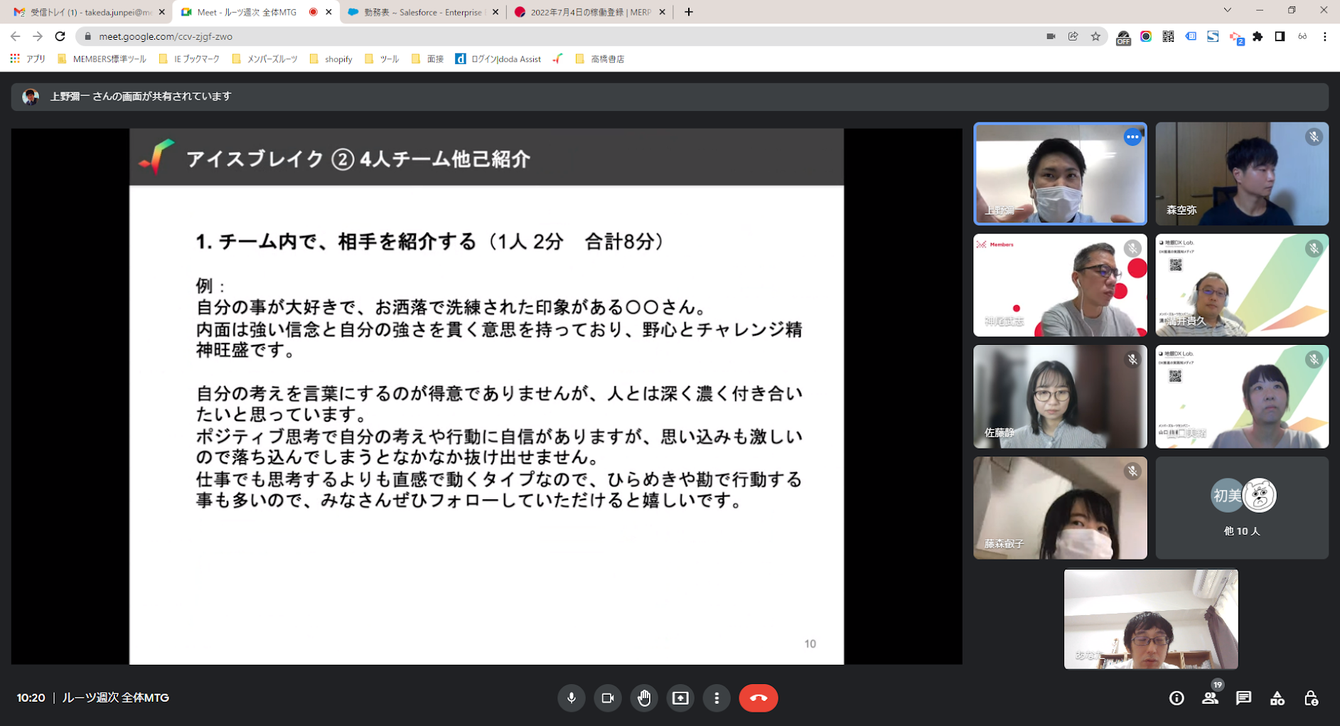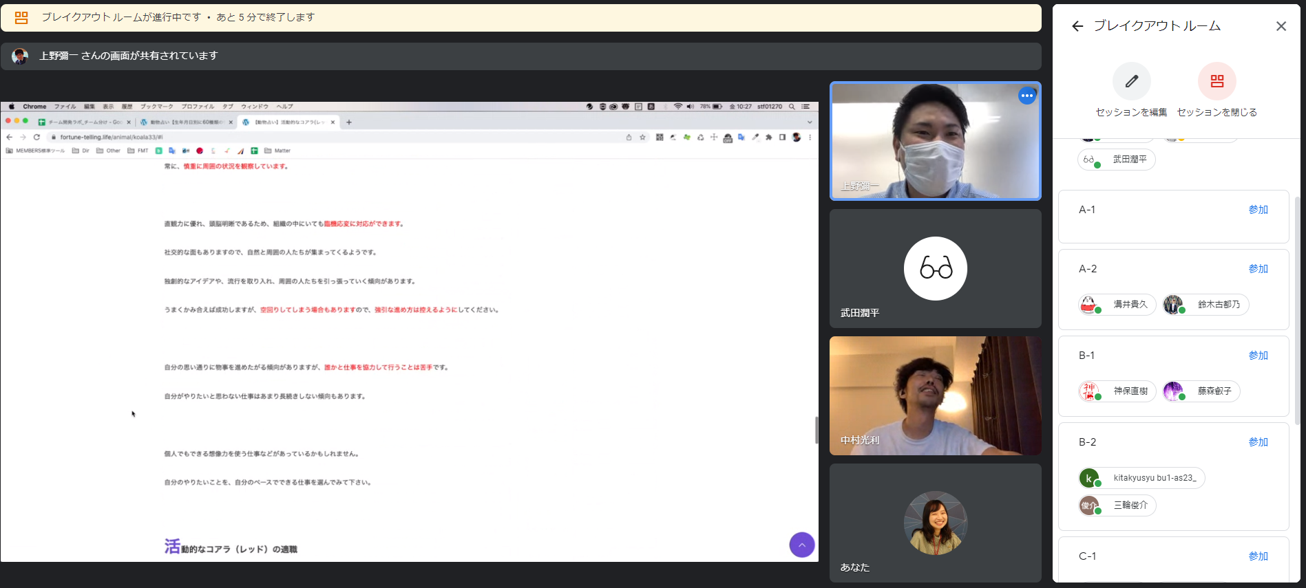 当日はリモートのワークショップだったのですが、5チームに分けるワークが必要だったので、Google Meetのブレイクアウト機能などを利用をして、チーム分けを行うなど、スピーカー以外にサポート役も準備して、実際の運営を行いました。