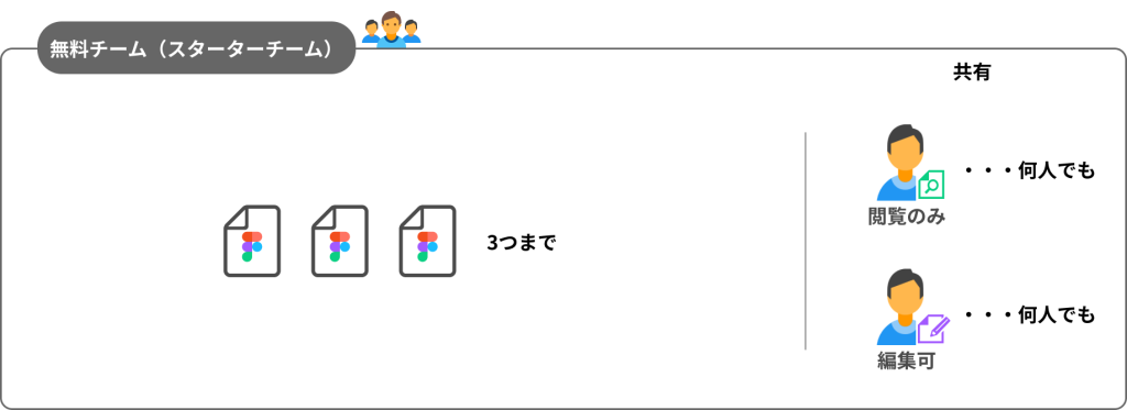 無料チーム(スターターチーム)は全てのプランで作成できる無料のチームです。ユーザーはいくつでも※1スターターチームを作成できます。この無料のチーム内で作成できるファイル数は、FigmaとFigJamでそれぞれ3つまで※2に限られていますが、編集可のユーザーや閲覧のみのユーザーは何人でも招待できます※3。