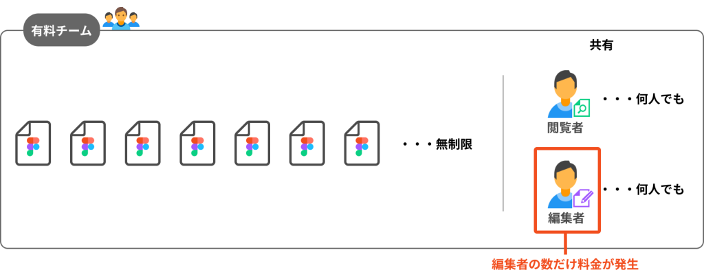 有料プランで作成できる有料のチームでは、ファイルがいくつでも作成できます。このチームには、編集者と閲覧者を何人でも招待できますが、チームを作成したオーナーに対し、チームにいる編集者の数だけ料金が発生する点に注意が必要です。