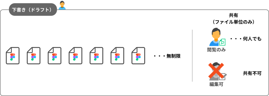 Figmaではファイル単位での共有と、チーム単位での共有が可能です。 下書きは、ファイル単位での共有のみをサポートしています。しかも下書きのファイルは閲覧のみでしか共有できません。