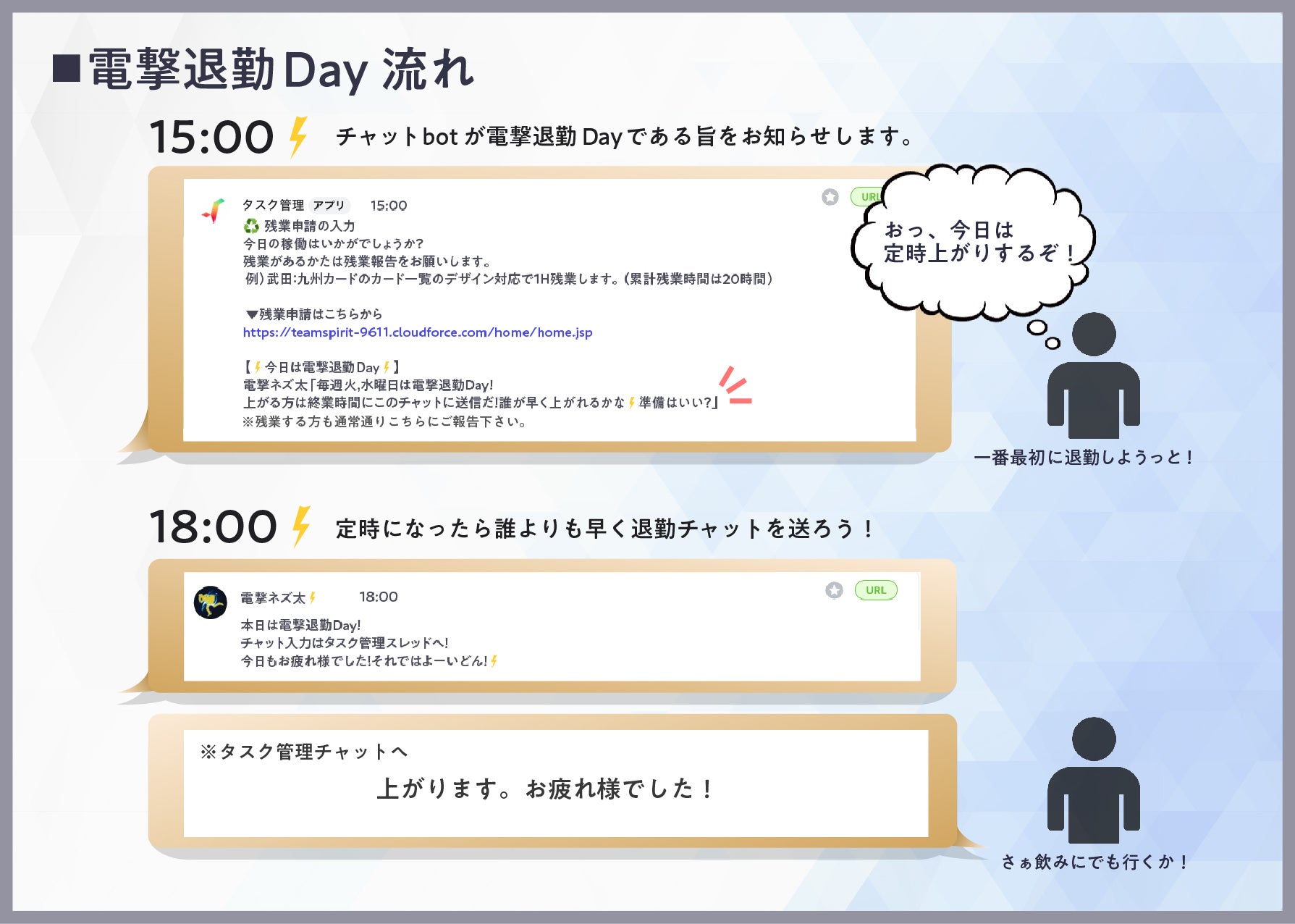 週2回の指定日、定時になったらチャットbotの合図と共に、いかに早く仕事を上がった旨を伝える「お疲れ様でした」チャットを送れるかの競争が始まります!