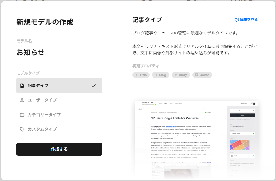 STUDIO CMSにはすでに用意されているモデルタイプが4つあります。それぞれの特徴をまとめました。