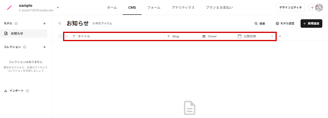 STUDIO CMSでは「モデル」という概念が存在しており、モデル内に扱うデータを必要な数だけ追加して管理します。