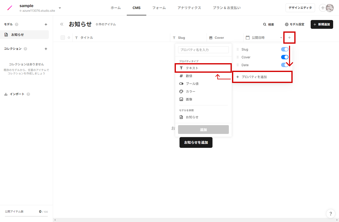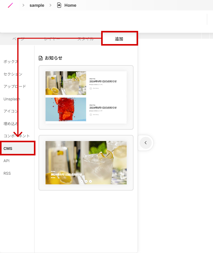 左端の矢印からメニューを開き追加タブからCMSを選択すると先ほど制作した「お知らせ」の項目が表示されます。