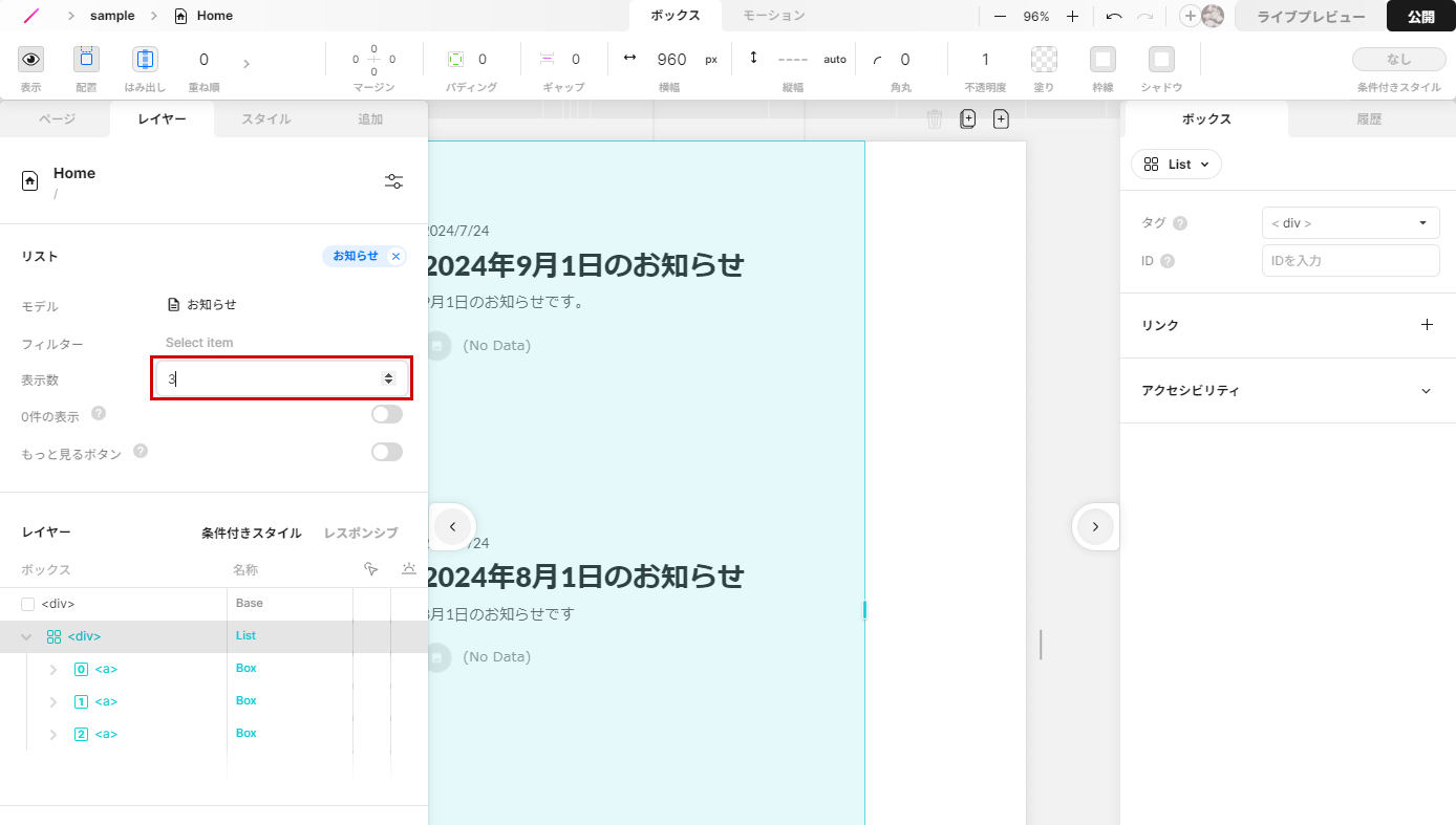 デフォルトだと項目数が少ないのでリストを選択した状態でレイヤーパネルから表示数を3に設定します。