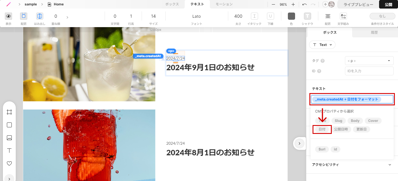 次に日付部分を修正します。日付のボックスを選択しボックスプロパティ→テキスト→日付を選択するとCMSのデータと紐付き、設定した日付が反映されます。