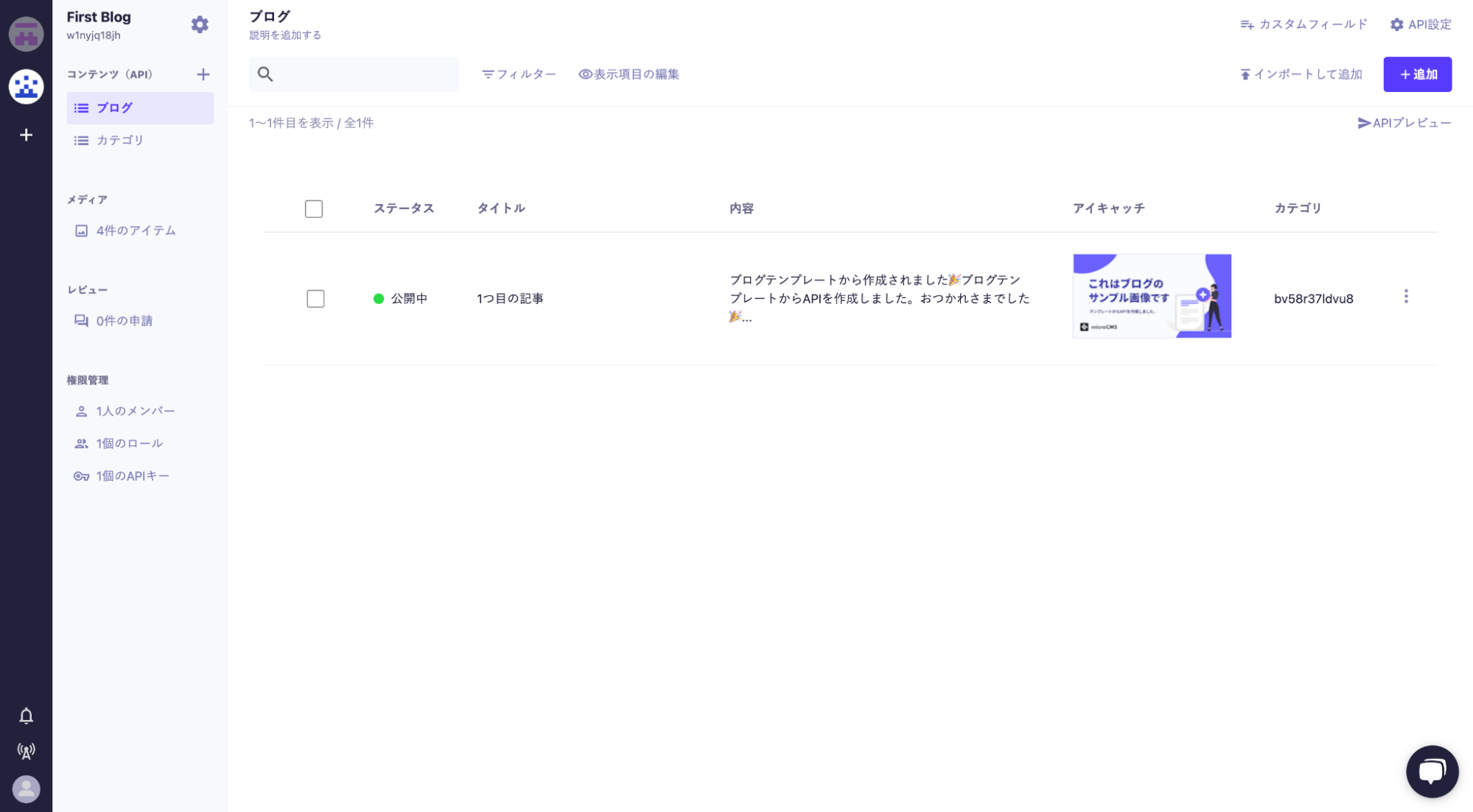 表示(フロントエンド)を持たないヘッドレスCMSは、管理画面がコンテンツ入力・管理に特化しており、構造が非常にシンプルです。サイドメニューはどのページでも固定表示しているので、操作方法に迷いやすい構成となっています。モダンなUIのため直感的な操作が可能でCMS初心者にもわかりやすいデザインです。