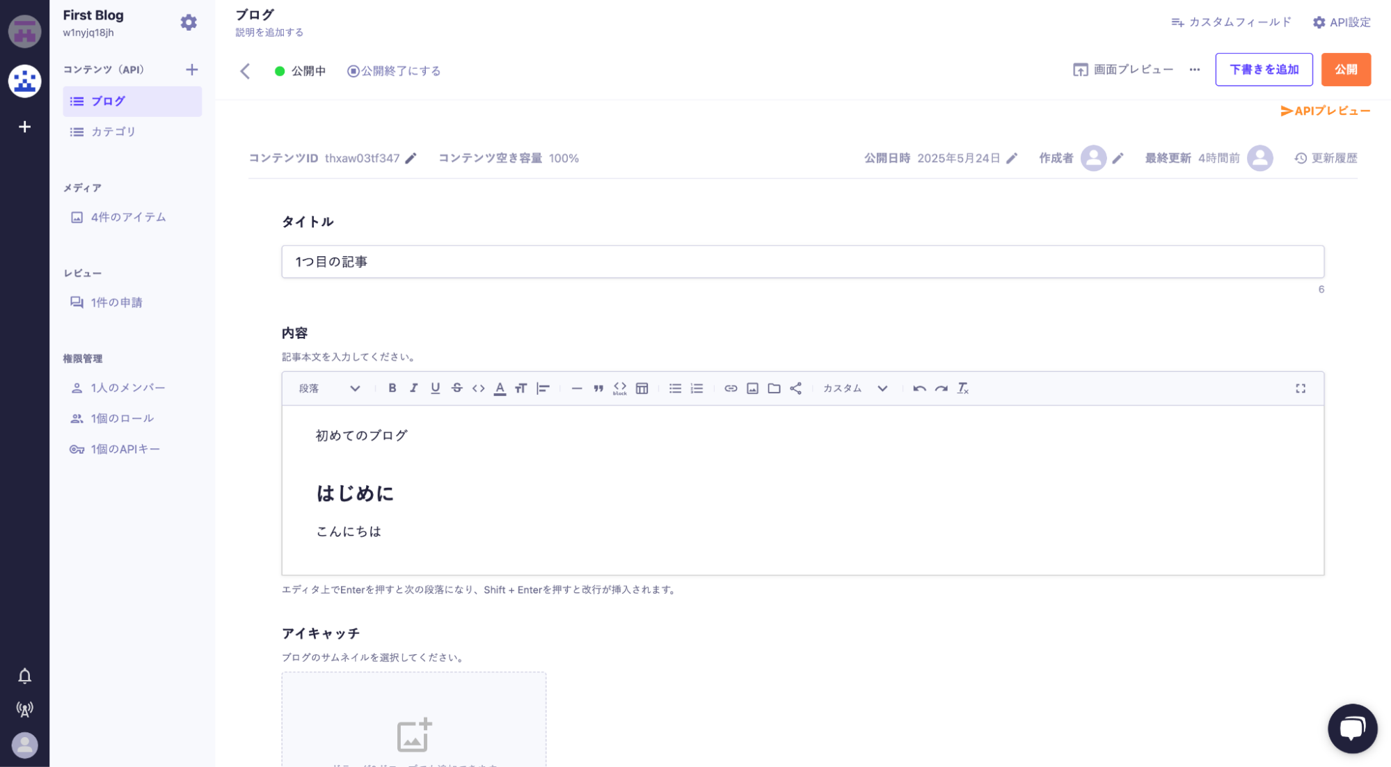 Contentfulもリッチエディタ形式で、Microsoft Wordのように直感的に操作できます。各要素が独立した入力フィールドで、フィールド説明機能もあり迷わず入稿可能です。