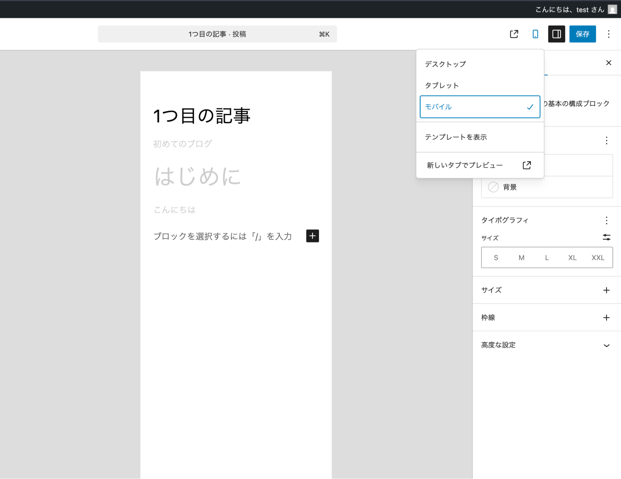 記事の即時プレビューに加え、サイト全体のプレビューも確認できます。PC・タブレット・スマートフォンとのブラウザサイズ切り替え表示も管理画面で確認でき、レスポンシブデザインのチェックに便利です。