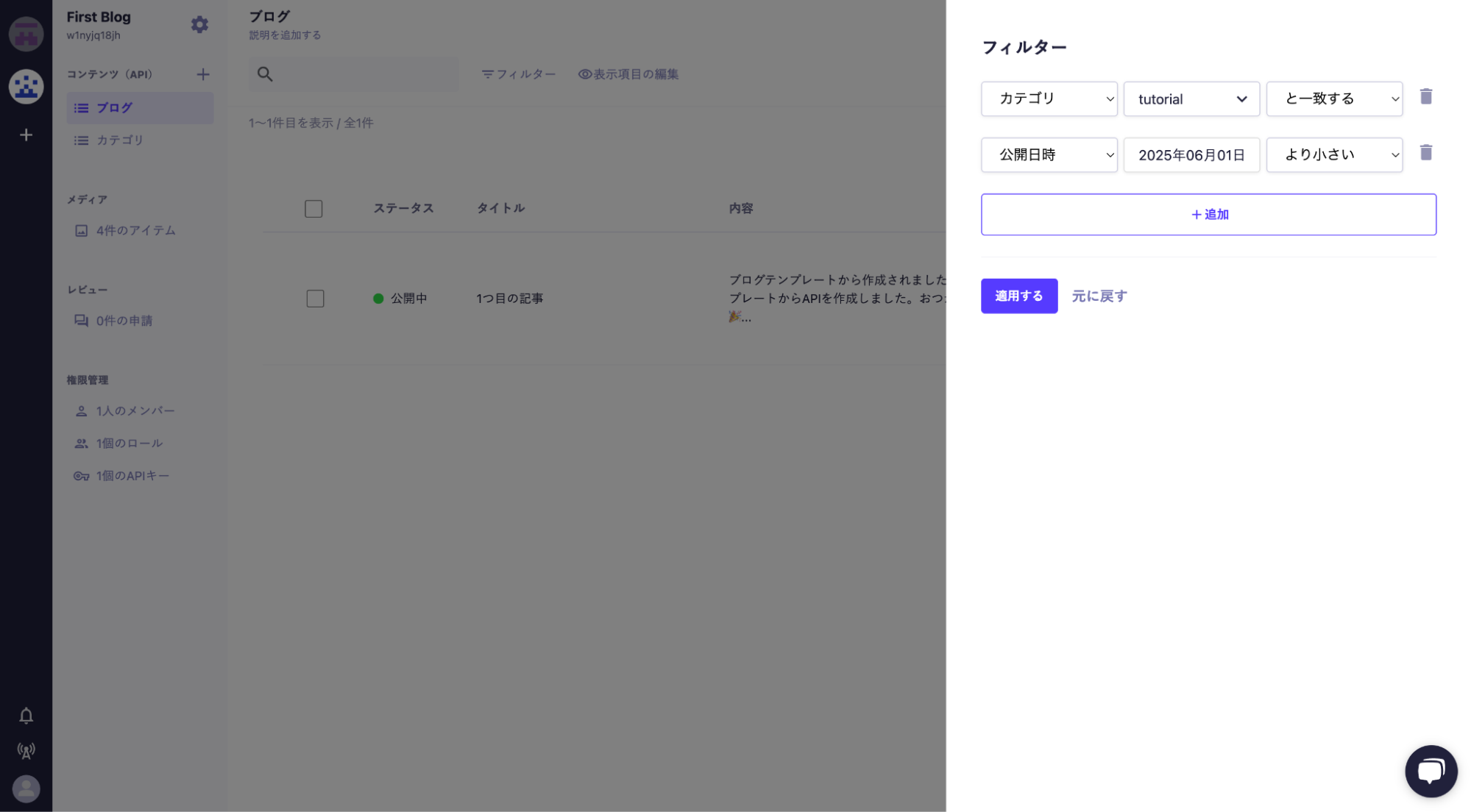 標準ではキーワード検索とコンテンツに基づいた項目のフィルターにより記事を絞り込み表示します。高度な絞り込みを行うには、カスタム開発やプラグインが別途必要です。