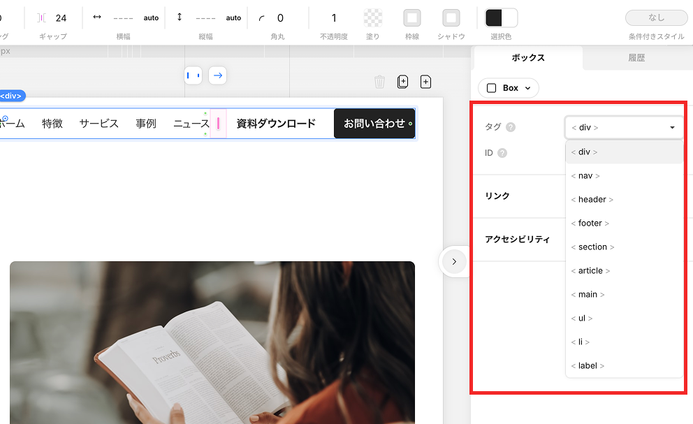HTMLタグを設定する際は、要素を選択し、画面右の設定パネルにある「タグ」からHTMLタグを選択することができます。