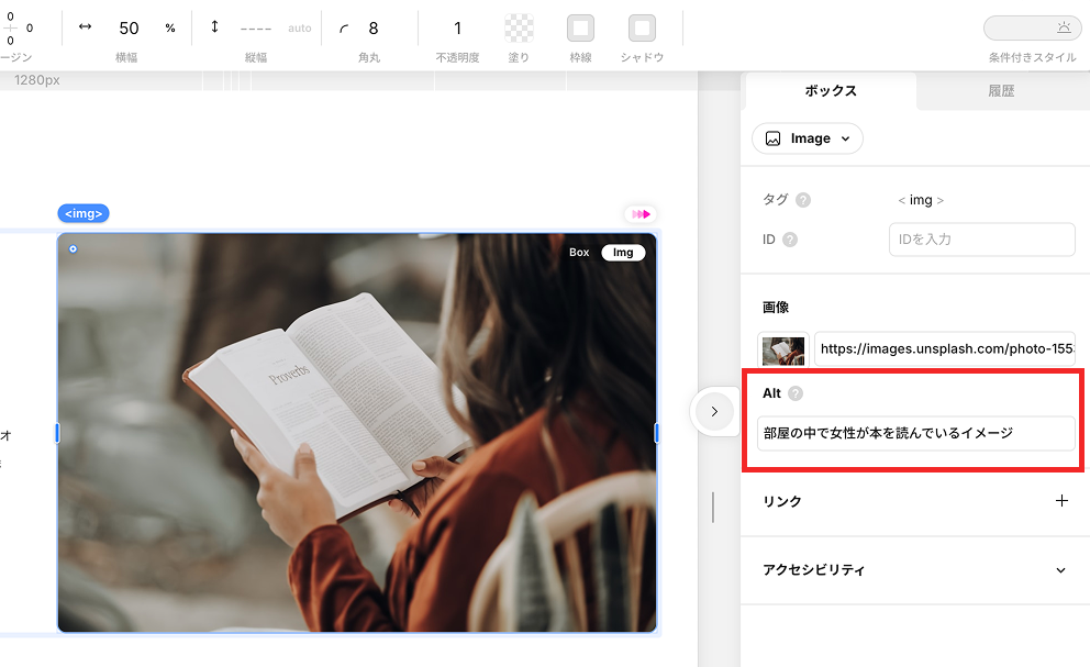 Studioでは、imgを選択すると、画面右の設定パネルにある「Alt」」から代替テキストを設定できます。