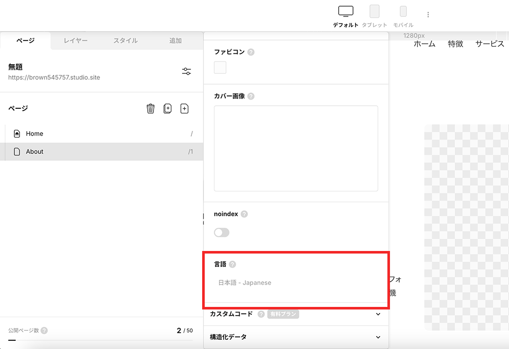 Studioでは、サイト全体または個別のページ単位で言語設定が可能です。