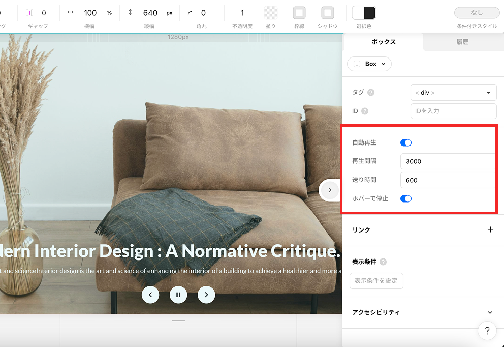 Studioでは、「追加パネル」の最下部から「Carousel」をドラック&ドロップすることで簡単にカルーセルを追加できます。「自動再生」をオンにする場合は、併せて「ホバーで停止」も設定するようにしましょう。