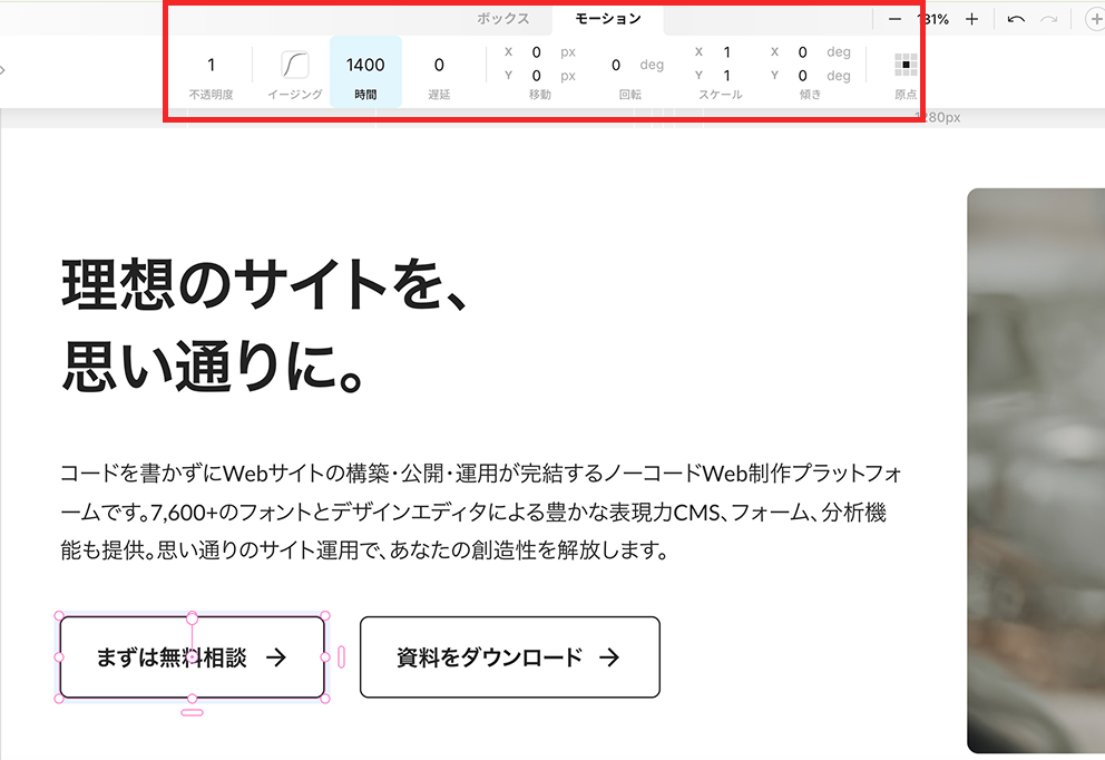 Studioでは、上部パネル「モーション」からアニメーションの時間を設定することができます。必要以上に目を惹くアニメーションは、アクセシビリティの低下につながるため避けましょう。