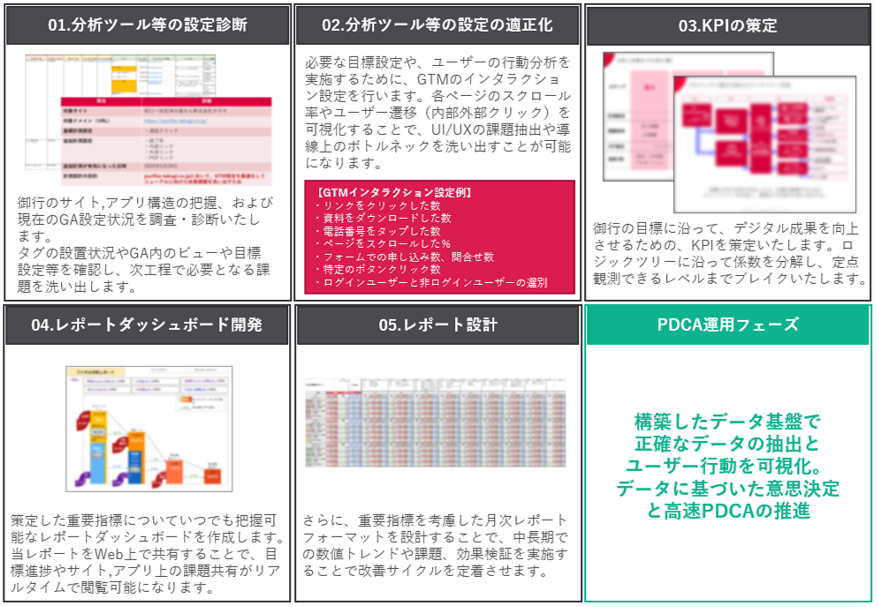 実際に支援を開始する際には、自社に持ち帰ってレポートを作成するのではなく、貴行のご担当者さまと、貴行のデジタルマーケティングで実現したい目標(KGI・KPIの策定)を一緒に行い、どのような指標を取っていくべきかなどの方針を決めてから、必要な分析タグの設計・レポートの実装を行います。