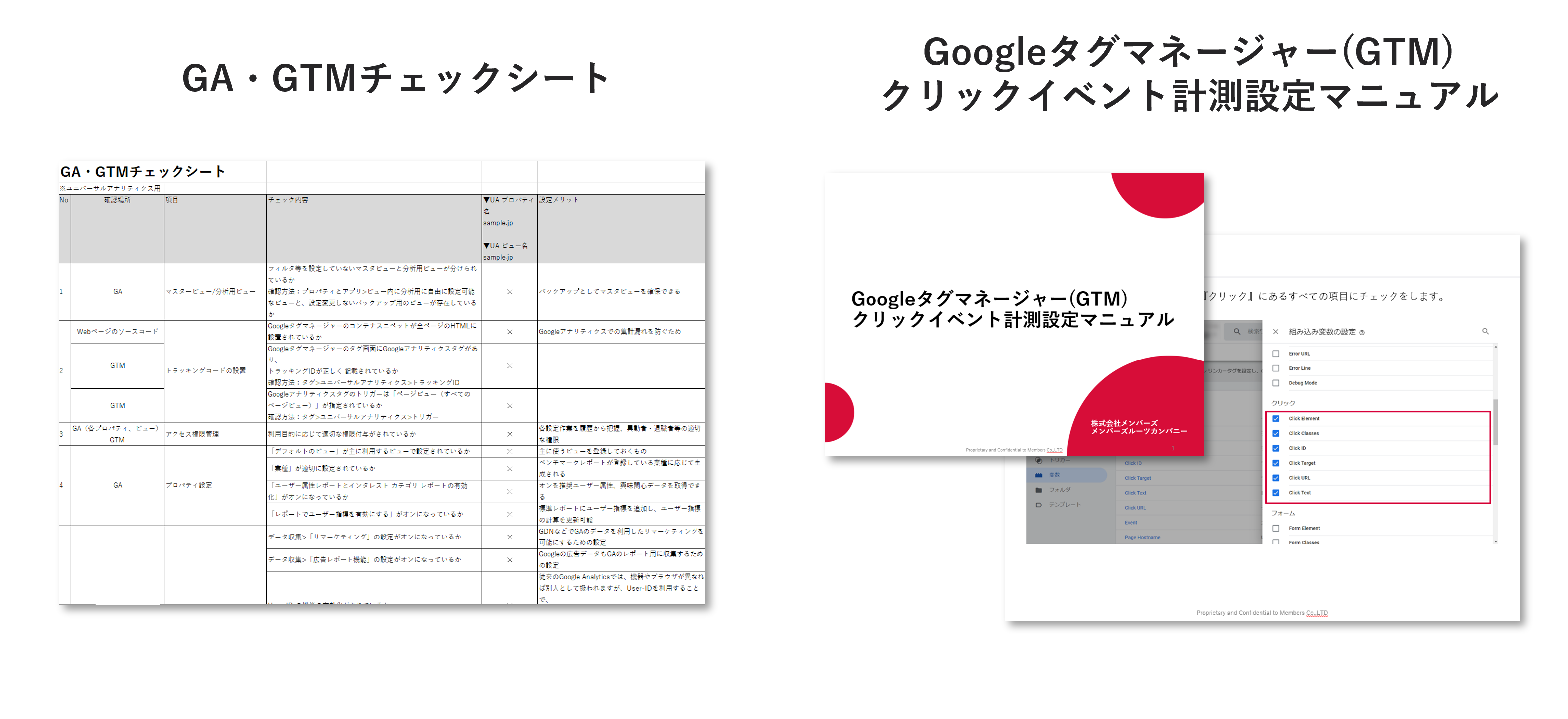 本動画では、google analyticsや、google tag managerの設定状況の確認方法や、分析基盤構築の際の設定方法などについて説明しており、動画視聴のお申込みをいただいた方へ特典として「GA_GTM_チェックシート」「Googleタグマネージャー(GTM)クリックイベント計測設定マニュアル」を、動画と一緒にお送りいたします。
