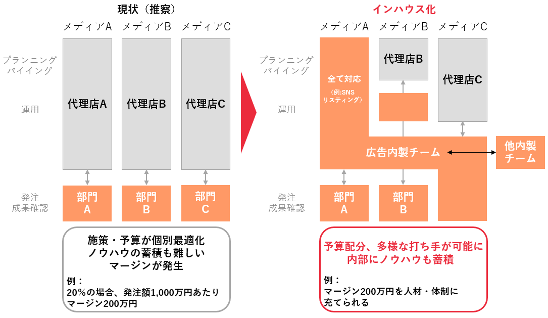 ・複数の代理店に任せており、勝ちパターン、各種ナレッジの横展開が滞る。