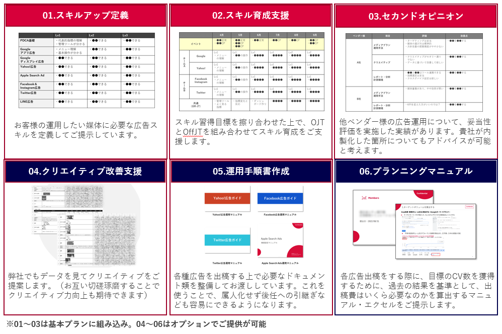 実際に支援を開始する際には、媒体ごとに広告スキルをレベル別に定義し、ご要望をヒアリングした上で誰にいつまでに教育するかを育成プランとしてご提示します。